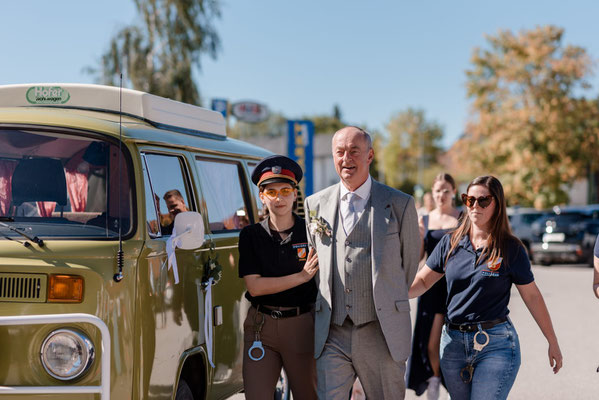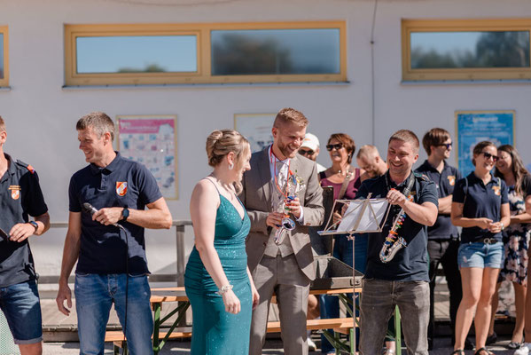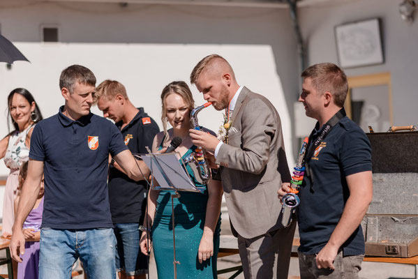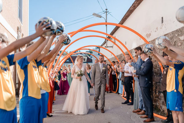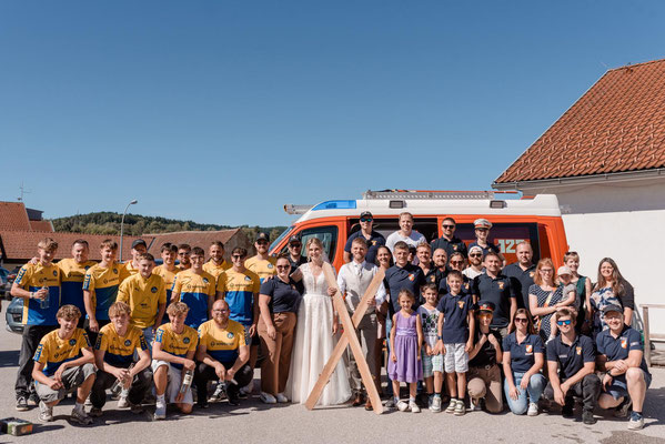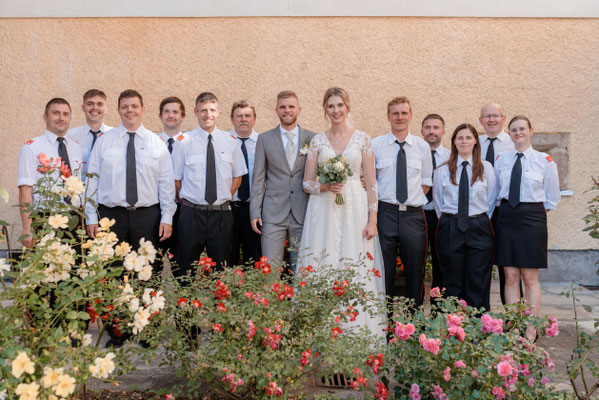 Nachdem beim Absperren gemeinsam mit den Spielern des UFC Lok Langschlag das Brautpaar einige knifflige Aufgaben lösen musste, nutzte viele Kameradinnen und Kameraden danach die Möglichkeit, dem Brautpaar nach der Hochzeitsmesse Spalier zu stehen.